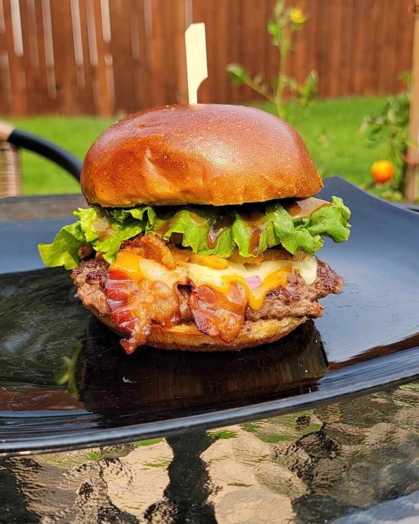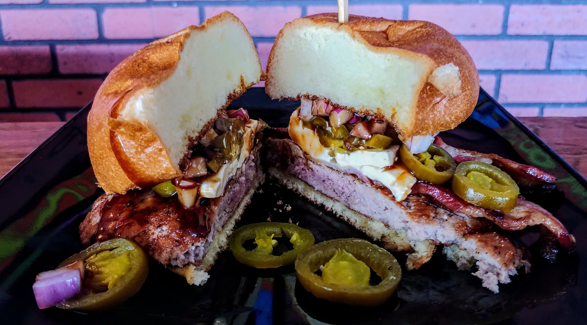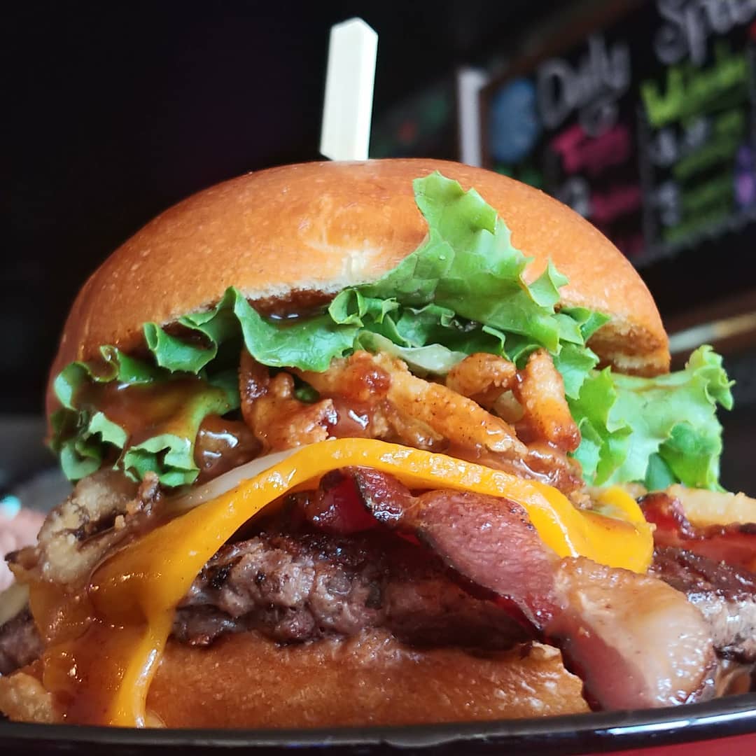 Cheddar and habañero pepper jack slather this yummy patty that comes drizzled with our spicy and sweet jamaican jerk sauce and built up with fried onion tanglers,green leaf and bacon. ‘Scuse me, while I eat this fry!