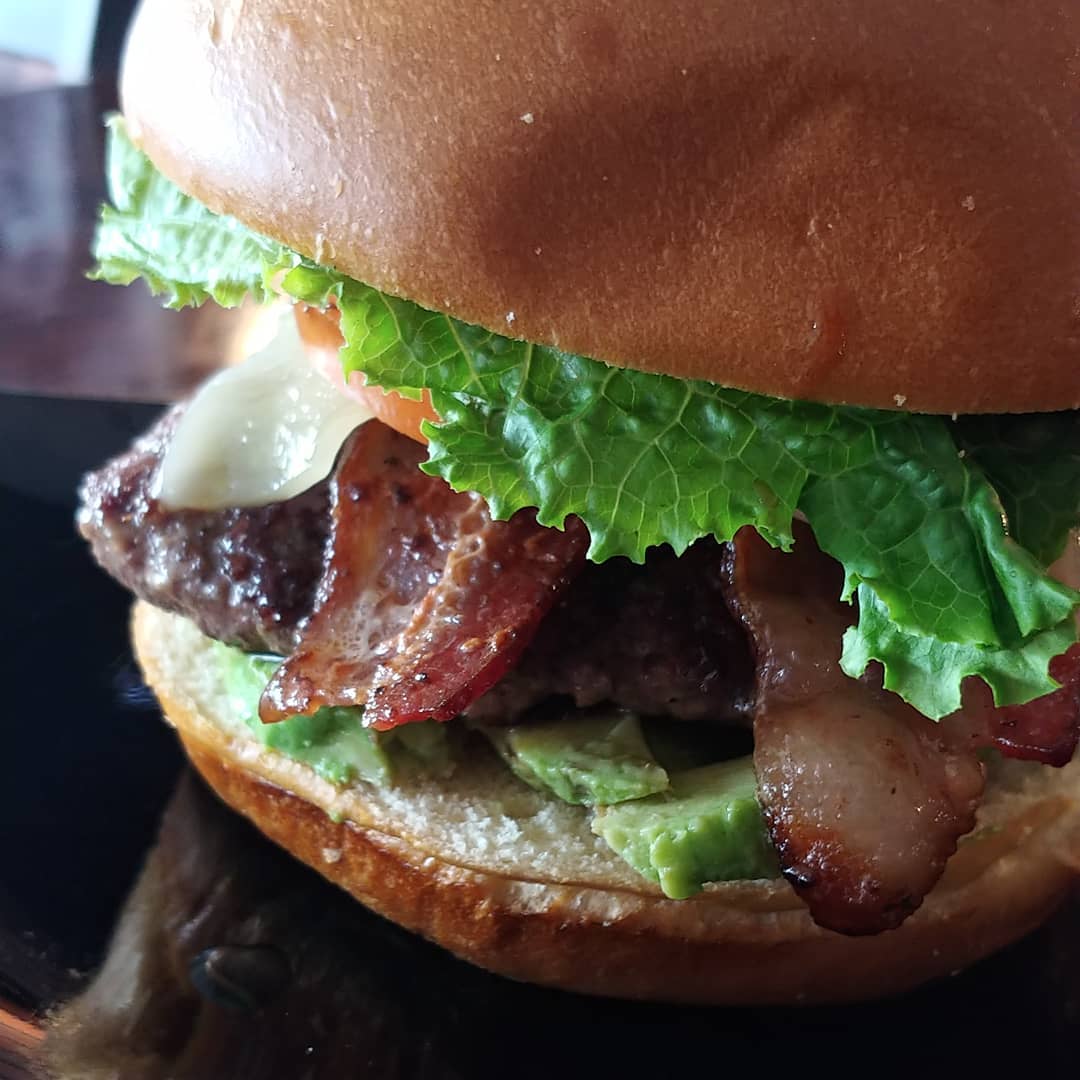 Avocado, swiss, bacon, green leaf, tomatoes, red onions, mustard, mayo, and deli style pickles on a brioche bun.